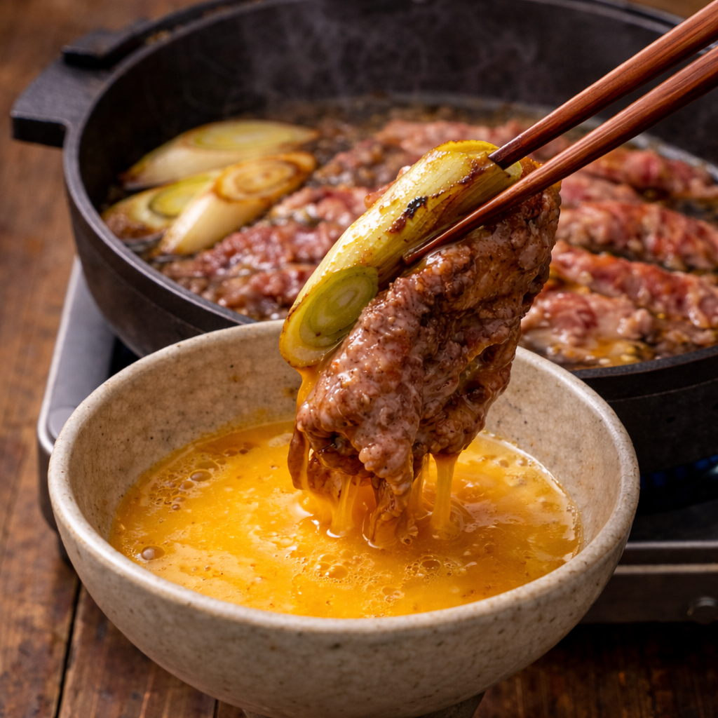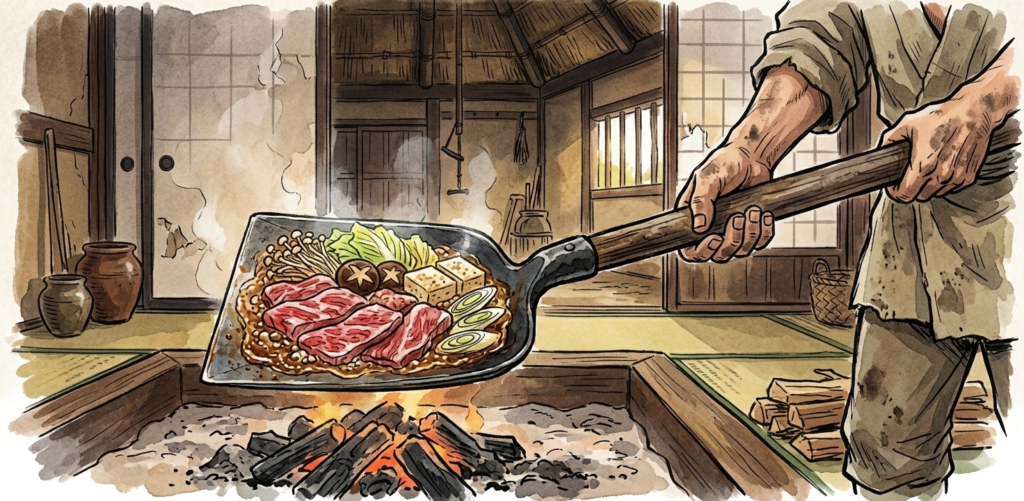 ご存知の方もいらっしゃると思いますが、すき焼きの「すき」は、かつて江戸時代に農具の鋤で魚などを焼いたのが始まりとされ、すき焼きの語源となっているようです。