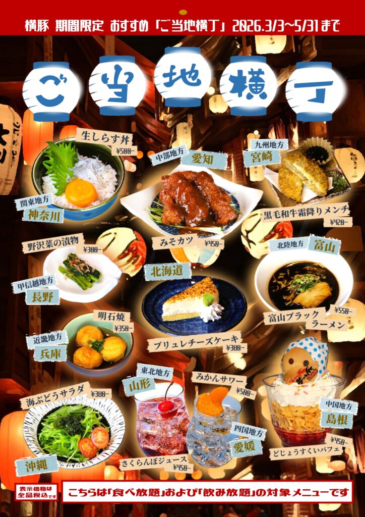 さて、横手豚玄亭では全国選りすぐりのグルメを集めた「ご当地横丁」を開催しております。