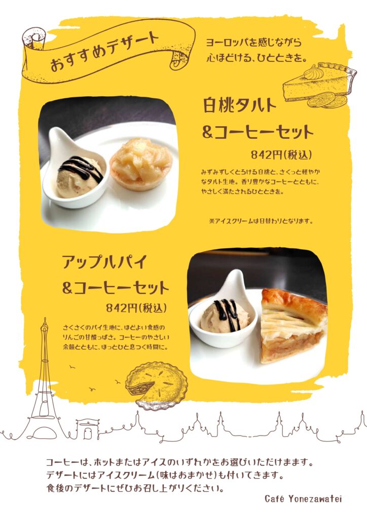 デザートは、ヨーロッパのカフェをイメージしたメニューにしました。イギリスが発祥地とされるアップルパイ、フランスが発祥地とされるタルトで、心ほどけるひとときをお過ごしください。