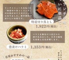 「特選切り落としランチ」のお肉を単品でもお召し上がりいただけるようにラインナップいたしました。秘伝のつぼだれに漬け込んだハラミもおすすめです。セロリのナムルは、焼肉の途中にクセになる美味な逸品です。