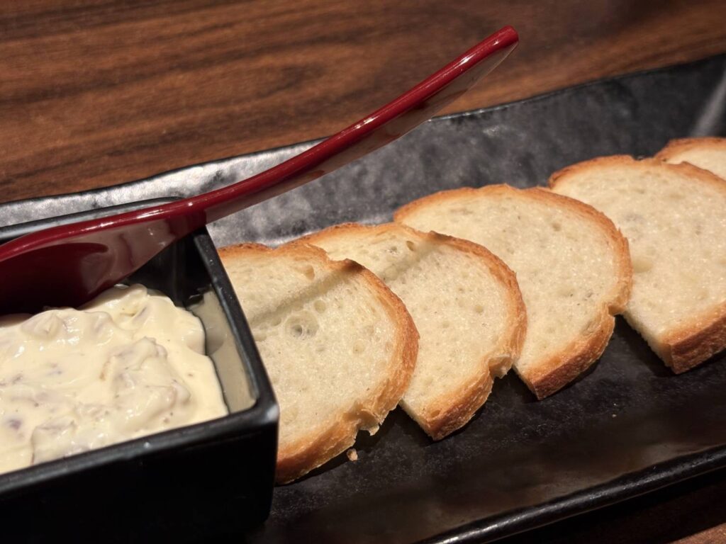 「金のいぶりがっこ」にクリームチーズと蜂蜜を合わせた特製ソースをつくりました。厚切りのバケットにつけてお召し上がりください。さくらワインと共に、“食感” と “美味” のハーモニーをお楽しみください。