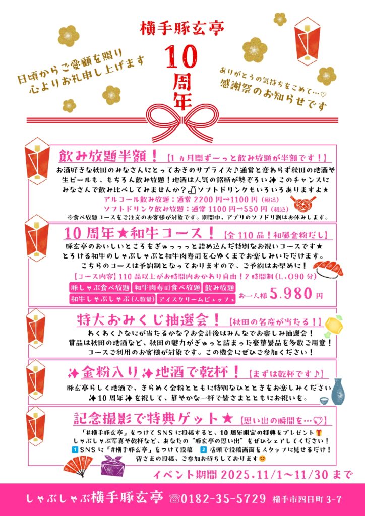 横手豚玄亭では10周年を記念し、11月1日(土)よりスペシャルイベントを開催いたします。