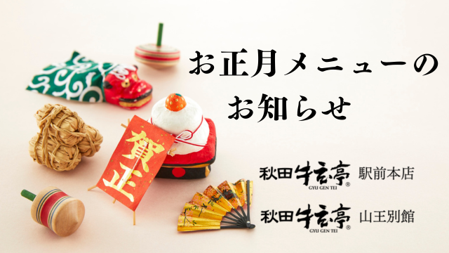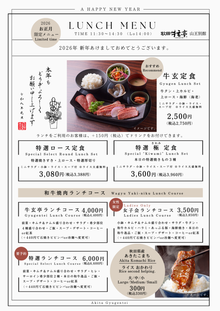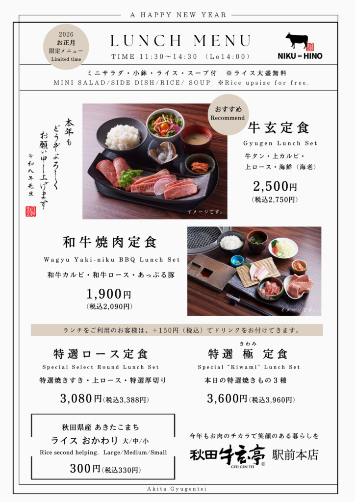 さて、お正月に営業する秋田牛玄亭 駅前本店・山王別館では、限定のランチメニューとさせていただきます。(1/2~1/4までの3日間)※各店メニューが異なります。