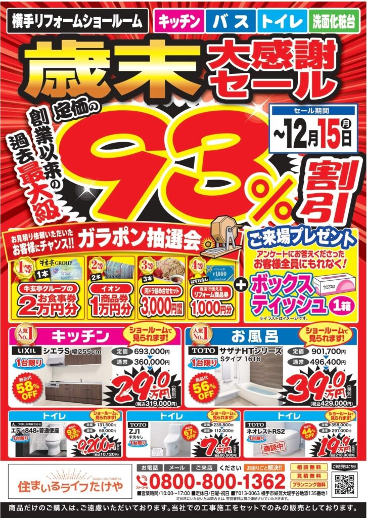リフォームで人気を誇る横手の「住まいるライフたけや」さんでは、歳末大感謝セールを12/15まで開催しています。創業以来、いまだかつてない過去最大級のビッグイベントとのことです。